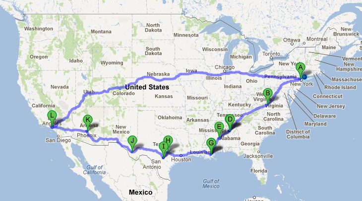 While driving Grandma’s 2000 Camry to Los Angeles to give to our son Mike we have decided to eat and drink at as many interesting spots as possible while still driving at least 8 hours per day. Our route will take us south from Fairfield, NJ to New Orleans and then across on I-10 through Texas and on to LA.